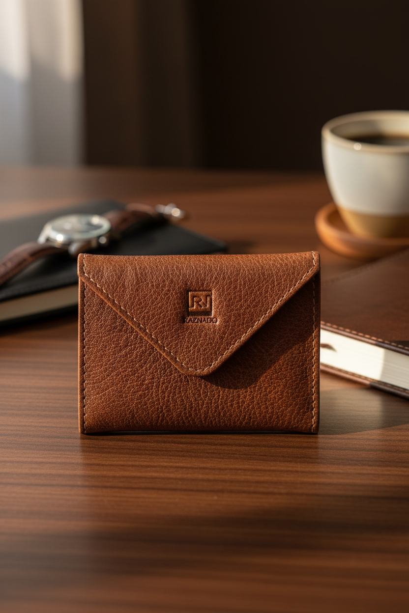 A minimalist envelope design crafted from premium pebbled leather in a rich, warm brown tone. Its compact profile and reinforced stitching make it a durable yet stylish choice for carrying essential cards and cash.